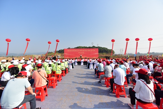 市长吴锦宣布项目开工,市“四大家”领导、鄂东职教集团负责人、市城发集团负责人共同为新校区奠基。