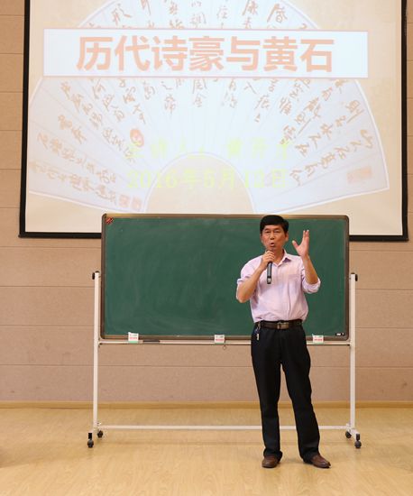 黄开才教授,原黄石市广电总局副局长、湖北师范大学客座教授,在书法、文学方面颇有造诣,是黄石市文化名人。他以《历代诗豪与黄石》为主题,通过分享诗匠李白、词匠苏东坡与黄石的故事,让我校360余名师生享受了一顿别样的文化大餐。