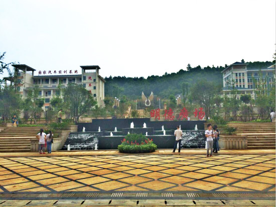 从学校中门拾级而上,是两座新的喷泉池和假山池。两座喷泉池之间,是新落成的“明德广场”。穿过明德广场,就来到了新的行政楼和膳食中心。